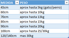 En la siguiente tabla se muestran las medidas y peso aproximado que soporta cada uno, tomar como referencia el peso de la mascota.